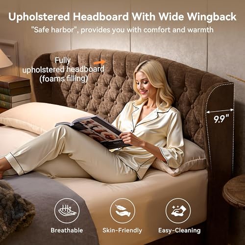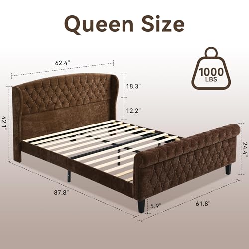 BedsPick Chenille Sleigh Queen Bed Frame with Wingback Headboard