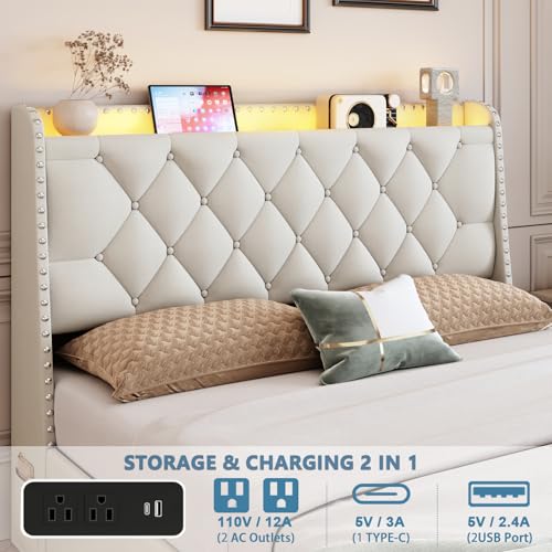 Experience the ultimate blend of style and functionality with the Beige Queen Bed Frame featuring a storage headboard and charging station, perfect for modern bedrooms.