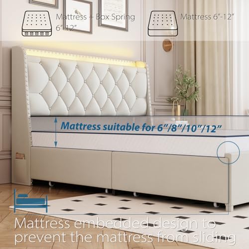 Beige Queen Bed Frame with Charging Station & Storage Drawers