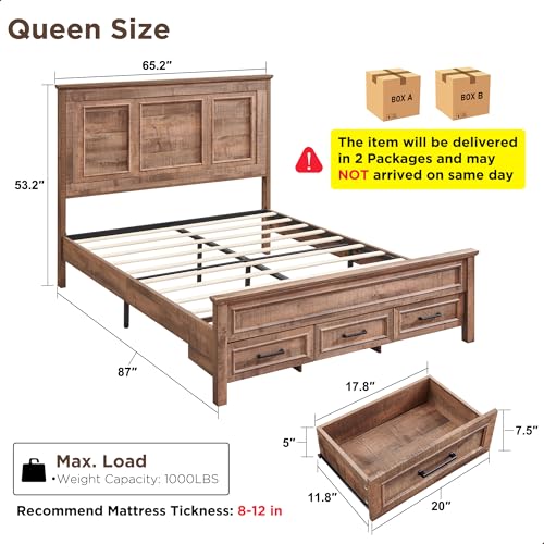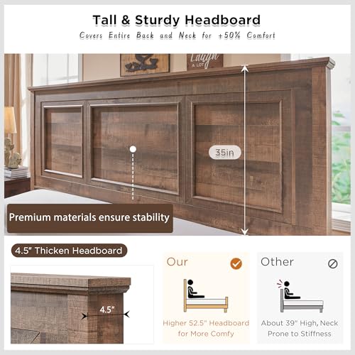Transform your bedroom with the ACCOHOHO Farmhouse Queen Size Bed Frame. Featuring a stunning 52″ tall headboard and rustic wood finish, this bed combines style and comfort. Its tall footboard includes three hidden drawers for discreet storage, while a robust design ensures stability and noiseless nights. Enjoy effortless assembly and a cozy cottage retreat ambiance in your home.
