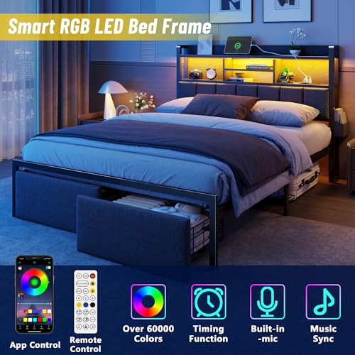 Transform your bedroom with the Furnulem Queen Bed Frame! This stunning black metal platform features a plush upholstered headboard, RGB LED lights for a vibrant ambiance, and practical storage drawers for organized living. Enjoy charging convenience with built-in outlets and USB ports, all while benefiting from a sturdy, noise-free design that supports up to 1200 lbs. Easy to assemble and perfect for any style!