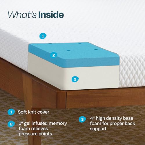 • Contour Support: Features 4 inches of high-density base foam topped with 1 inch of gel-infused memory foam, providing a supportive yet comfortable surface ideal for stomach and back sleepers.