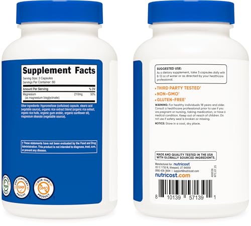 Unlock the benefits of magnesium with Nutricost Magnesium Glycinate Capsules! Each serving offers 210 mg of this essential mineral, carefully formulated for gentle absorption and minimal digestive discomfort. Available in three convenient sizes, these capsules are made in a GMP-certified facility and undergo rigorous third-party testing, ensuring high quality and purity. Elevate your wellness routine with this optimal magnesium supplement!