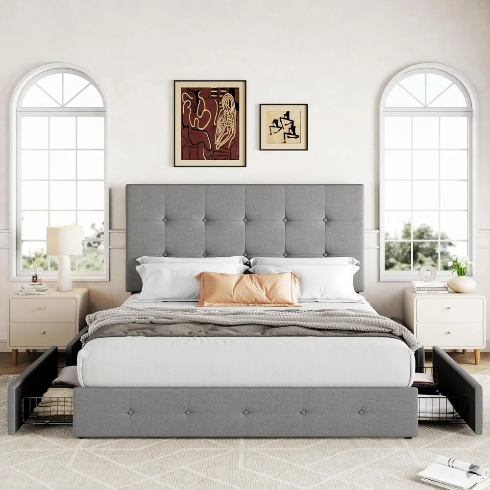Elevate your bedroom with this stylish queen size platform bed frame, featuring a luxurious upholstered headboard and square-stitched button tufting. With four spacious storage drawers, it combines elegance and functionality, perfect for keeping your space organized. Mattress not included.