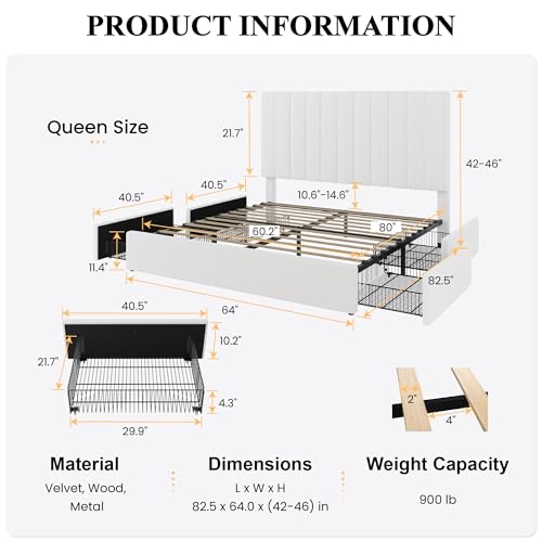 Transform your bedroom with the SHA CERLIN Queen Size Platform Bed Frame. This stylish frame features a chic vertical channel tufted adjustable velvet headboard and four spacious storage drawers, ideal for keeping your space organized. Built to support up to 900 lbs, the sturdy metal and wooden slat construction ensures a restful night’s sleep. Plus, enjoy easy assembly—no box spring needed!
