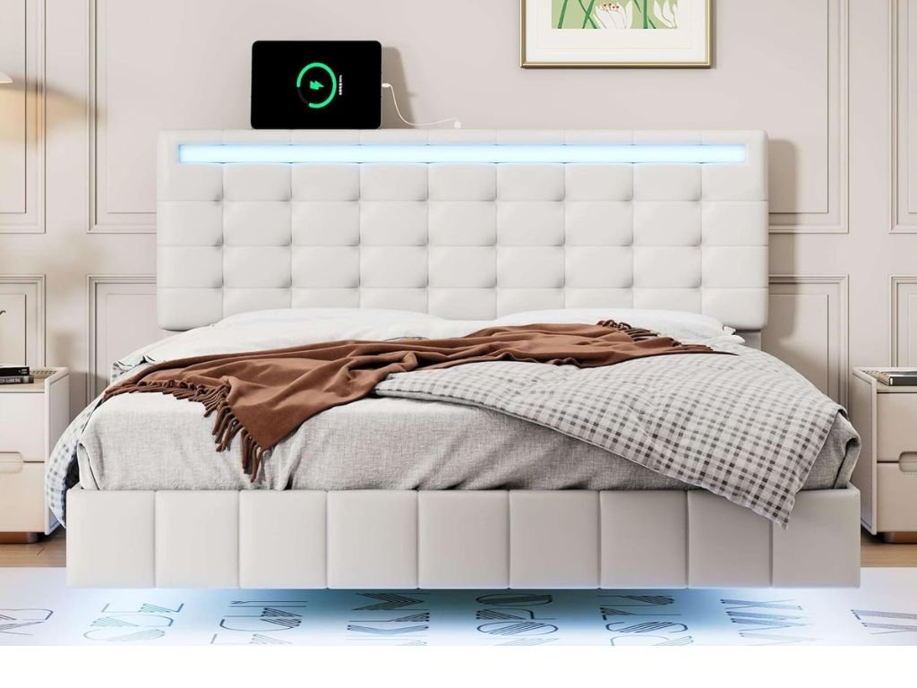Stylish Modern Full Size White Floating Bed Frame Review: LED Lights, USB Charging & Upholstered Comfort